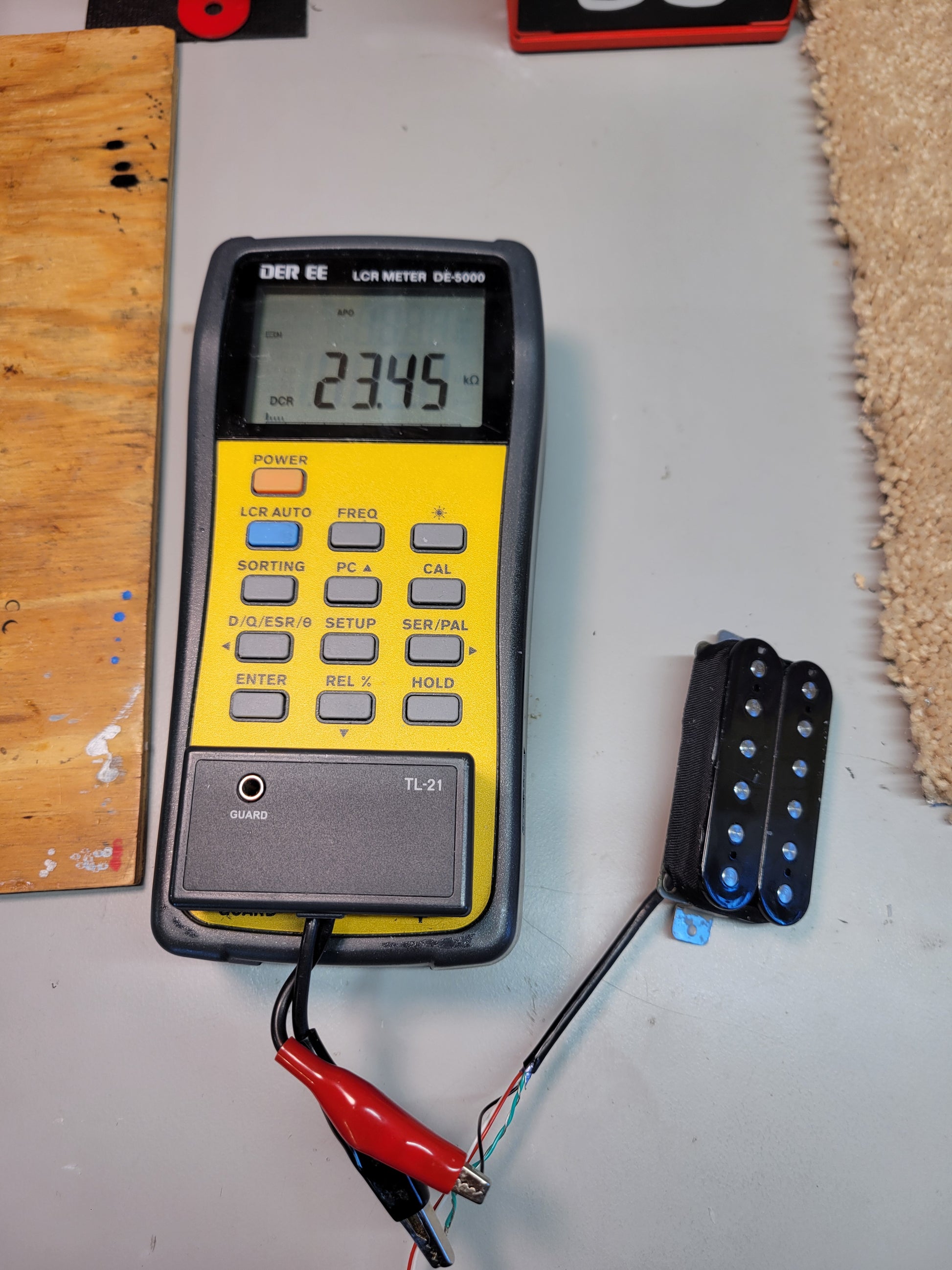 The bridge position is a whopping 23.45K DCR and inductance over 11 henries. Without zero preamps or 9-volt batteries. The neck pickup is a powerful as most high output bridge position humbuckers, yet it retains the articulation and cleans up as nicely as traditional output neck pickups.